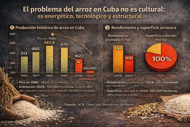 Este análisis amplía y actualiza los argumentos desarrollados en nuestro artículo previo “Crisis arrocera en Cuba: Dependencia, declive y el espejismo del autoabastecimiento” (agosto 2025), donde se examinan con datos las limitaciones estructurales de la producción arrocera nacional.