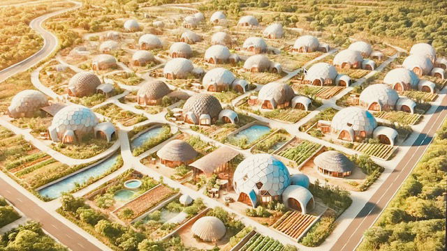 El núcleo social - Los Domos Comunitarios: En el corazón de la comunidad, domos geodésicos o monolíticos de mayor tamaño albergan funciones vitales: la escuela-domo, el policlínico-domo, el taller-comunitario y el centro de acopio. Estas estructuras, ultra-resistentes, sirven como refugios de última instancia durante emergencias.