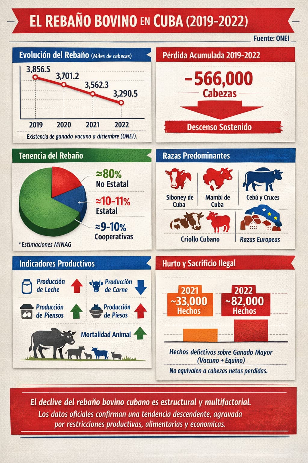 Entre 2019 y 2022, la existencia de ganado vacuno se redujo en aproximadamente 566 mil cabezas, lo que confirma una tendencia descendente sostenida. Al cierre de la redacción de este artículo, la ONEI no ha publicado el dato oficial consolidado correspondiente a diciembre de 2023. Cifras sectoriales y declaraciones públicas han mencionado una masa cercana a los 3,25 millones de cabezas, pero estas deben considerarse provisorias mientras no exista publicación estadística oficial.