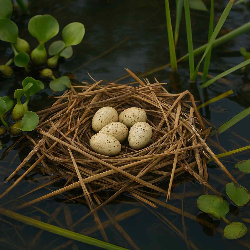 El nido flotante: Construido con tallos de enea, malangueta y hojas de jacinto de agua. Discreto y bien camuflado. A veces posee plataformas auxiliares donde los pichones descansan.