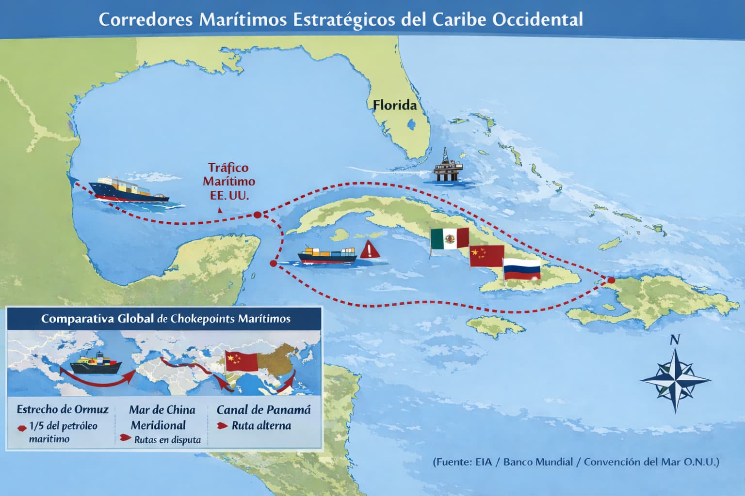 Aunque el Caribe occidental no constituye un chokepoint único de estas características, funciona como un sistema de corredores interconectados que conecta el Atlántico con el Golfo de México y el Canal de Panamá. Esta configuración lo convierte en un nodo logístico de gran relevancia para el sistema energético y comercial del hemisferio occidental.