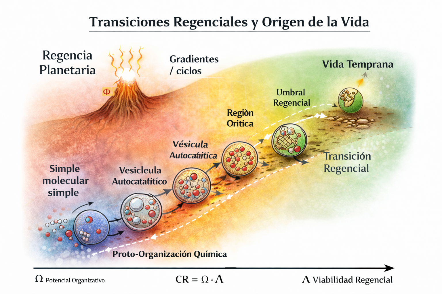 La emergencia de la vida puede interpretarse como la transición de un sistema hacia un régimen en el que su coherencia regencial supera un umbral crítico (CR_crit), permitiendo la estabilidad organizativa en el tiempo. Este umbral no es fijo, sino dependiente de la regencia en la que el sistema está inscrito.